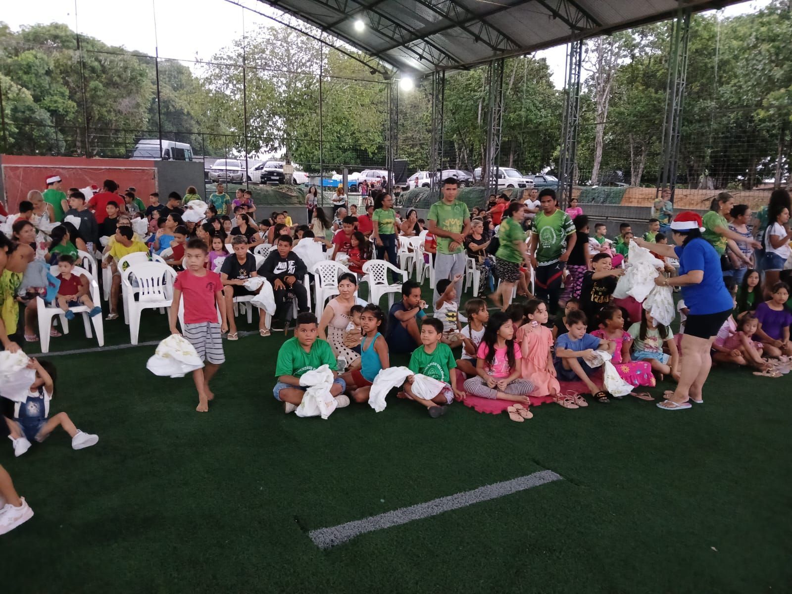 As crianças dos projetos desenvolvidos pelo MCVE, assim como seus irmãozinhos, participaram da chegada do Papai Noel na tarde desta quarta-feira (25), realizada pela Organização Comunitária Amigos do Papai Noel, no Centro de Formação Awa’ré/MCVE, no bairro Terra Nova, Loteamento Jardim São Luiz.